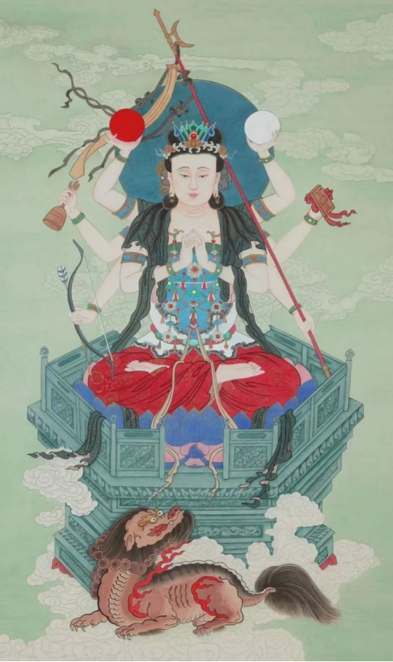 **Doumu Yuanshun** (also known as **Doulao Yuanshun**) is a highly revered goddess in the Taoist pantheon, regarded as the **Mother of All Stars** and the supreme deity who governs the operation of cosmic stars and controls the life, death, fortune, and misfortune of mortal beings. Her worship integrates ancient astral reverence, Taoist theology, and esoteric Buddhist elements, embodying a grand and unique divine status. The term “Doumu” literally means “Mother of the Big Dipper Stars”. Her iconography is exceptionally distinctive, typically depicted as a solemn divine figure with **three eyes, four faces, and eight arms** (or alternatively, four heads, three eyes, and six arms). In her hands, she holds various ritual implements such as the sun, moon, treasure bell, golden seal, bow, and halberd, seated on a divine chariot pulled by seven pigs (or lions). This multi-faced and multi-armed form symbolizes her boundless divine power to oversee the Three Realms, command heaven and earth, and generate all living things.