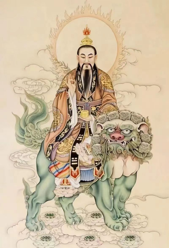 His iconography typically depicts him as a solemn imperial figure wearing a beaded crown and court robes, holding a jade scepter or a willow branch and purification vase. Sometimes, he appears in a majestic form riding a nine-headed lion (named “Nine Spirits Primordial Sage”), symbolizing his divine power to subdue the netherworld and redeem departed souls.